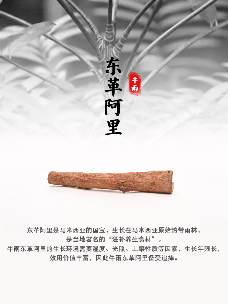 众所周知,,天然野生东革阿里全是生长在马来西亚热带雨林,受天然的恩赐,这里的东革阿里才具有高药用,好功效。牛雨东革阿里就是生长在这里,以致它对人体的药用功效是十分显著,而且是老字号,许多消费者都慕名购买。天然野生食材,对健康的帮助更好。