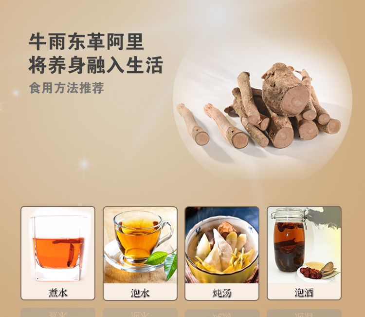 黑东革阿里作为食材,它的广泛药用价值对人体的作用十分大,使用方式也是很广泛,泡水、煮水、炖汤以及泡酒都是较多人使用的方式,其中又以泡水这种使用方式为最普遍。将黑东革阿里20克放入杯中,加适量100度的开水泡上及分钟就可以享用了,这种方法既简单又方便,更适合上班一族用来补充能量。在这里补充一句,建议食用正宗野生的牛雨东革阿里所达到的效果才好。