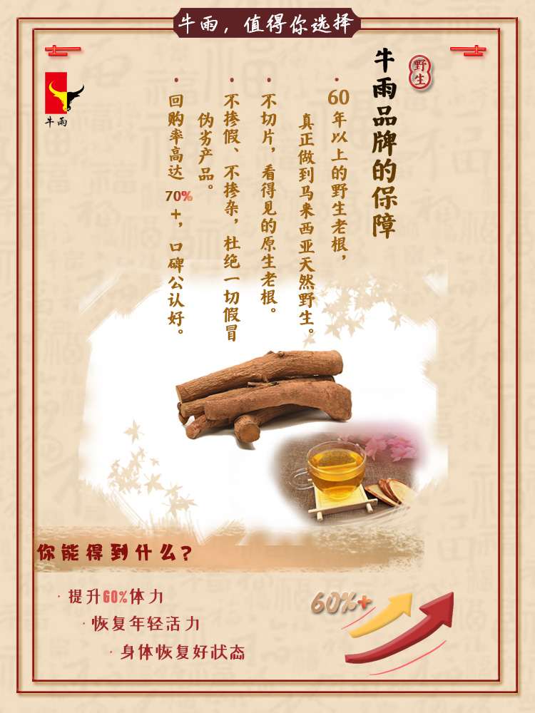 原料决定了牛雨东革阿里品质的奠基,牛雨的原料都是来自马来西亚原始热带雨林,从源头保障了高品质产品。与此同时,牛雨东革阿里甄选天然野生东革阿里,根龄锁定在50年以上,保持原根不切片,杜绝掺杂造假,确保无添加成分。
